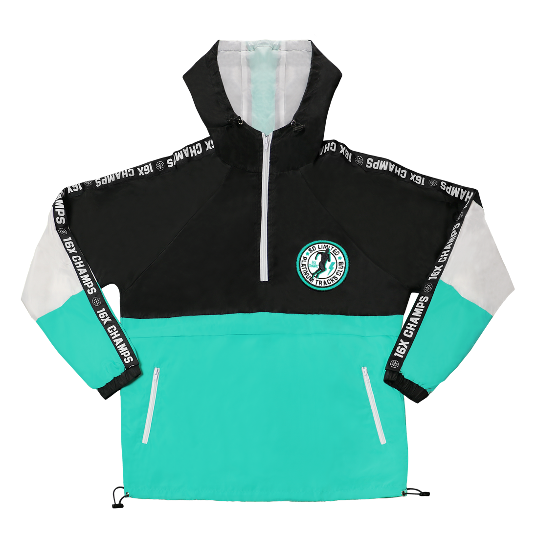 As part of the Platinum Tracks Club Collection, the Shinedown '16X Champs Windbreaker' features Shinedown logos on the front and back and 16X Champs down the sleeves of a unisex turquoise and black color block windbreaker. This windbreaker is double lined with elastic pull cords around the waist and hood. Please check size guide for best fit.