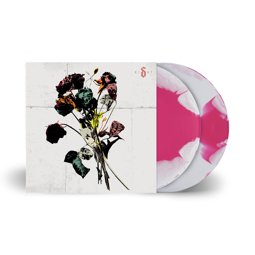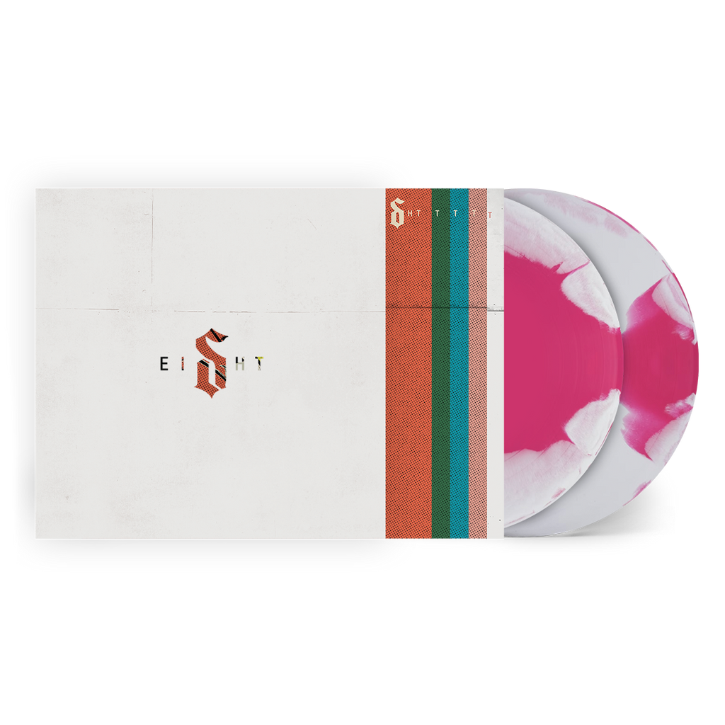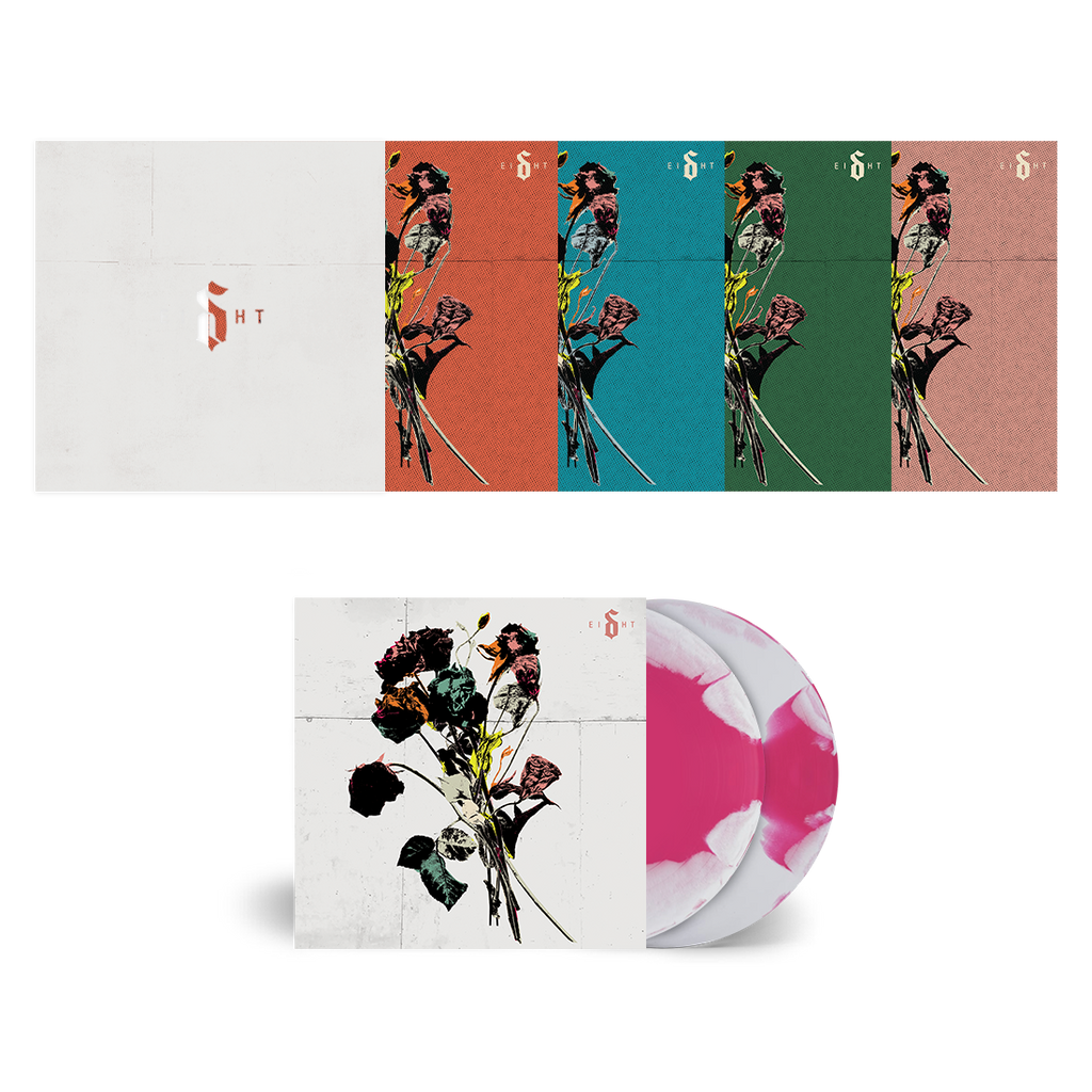EI8HT, the eighth studio album from Shinedown, on pink and white vinyl and includes a slipcase with a die-cut Shinedown logo and 4 interchangeable exclusive album cover art prints