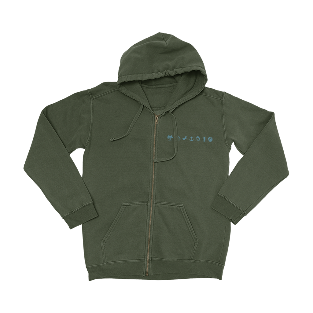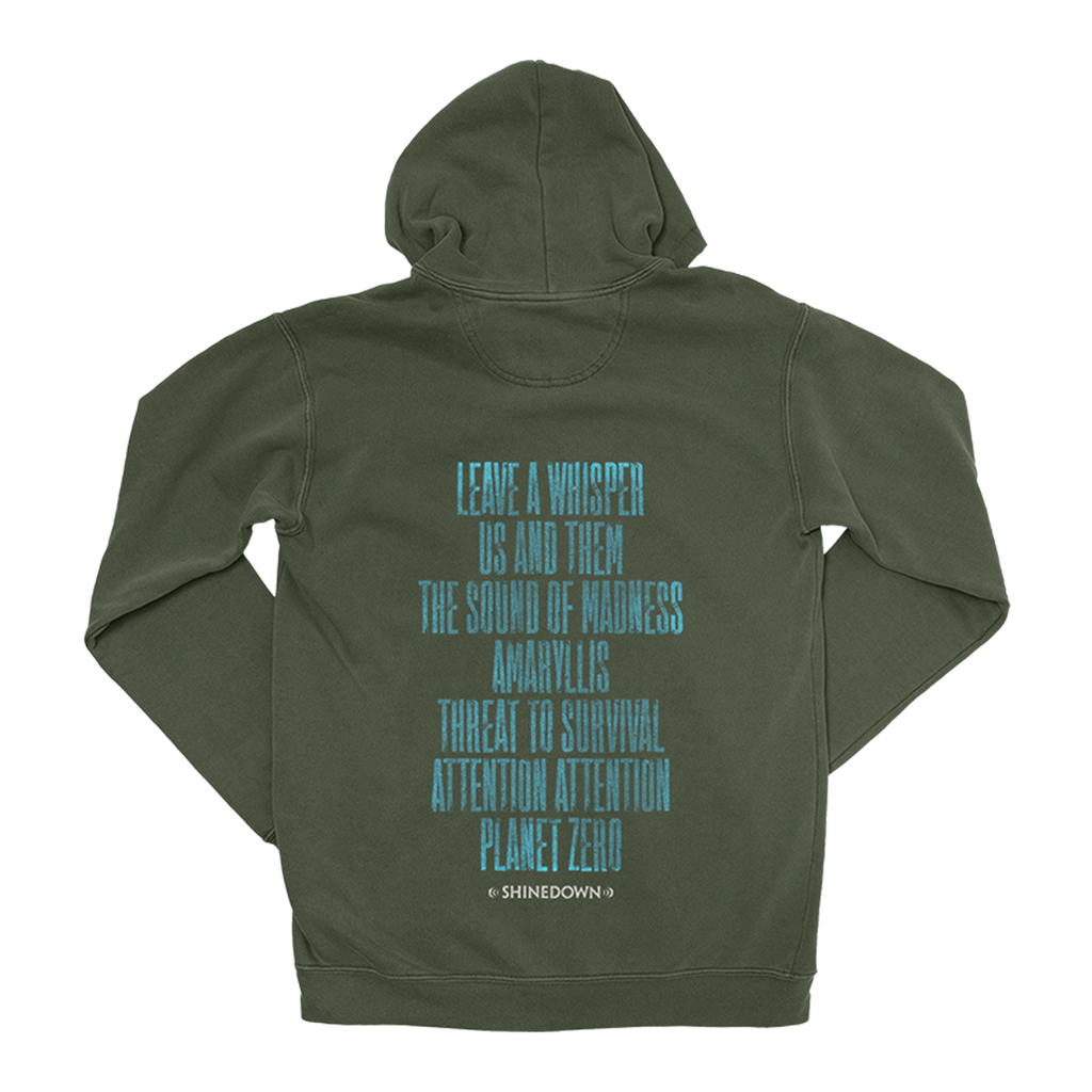 The Legacy hoodie from Shinedown is an army green 80% cotton/ 20% polyester zip-up unisex hoodie. The front pocket are features icons representing the bands discography. The back features the name of every album stacked above the band's name. These designs are printed in a distressed blue.YOU MIGHT ALSO LIKE