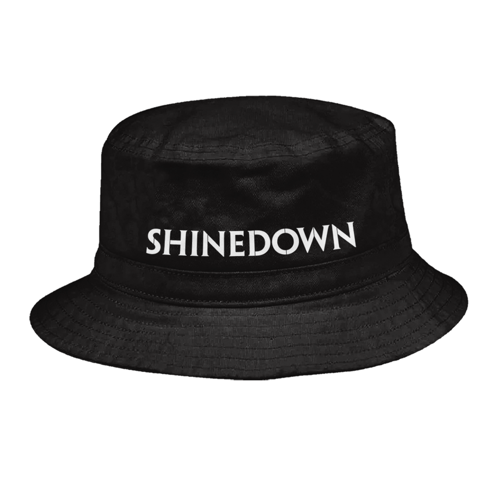 The Logo Bucket Hat from Shinedown is a black 100% cotton twill hat featuring the bands name printed in white on the front.