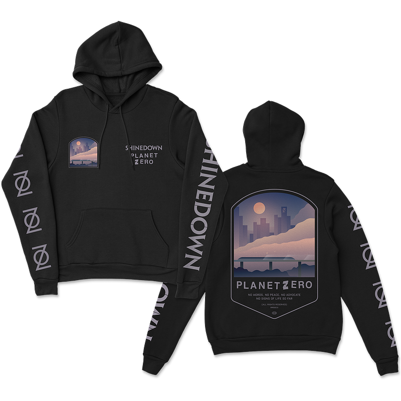 The No Peace Hoodie from Shinedown is a black pullover unisex hoodie. The front left pocket area has the text "Shinedown Planet Zero" and the right pocket area has an illustrated landscape design. The back features a larger image of the illustrated landscape above the lyrics "no words no peace no advocate no signs of life so far". The left sleeve has the band name printed along the length and the right sleeve repeating planet zero logos.
