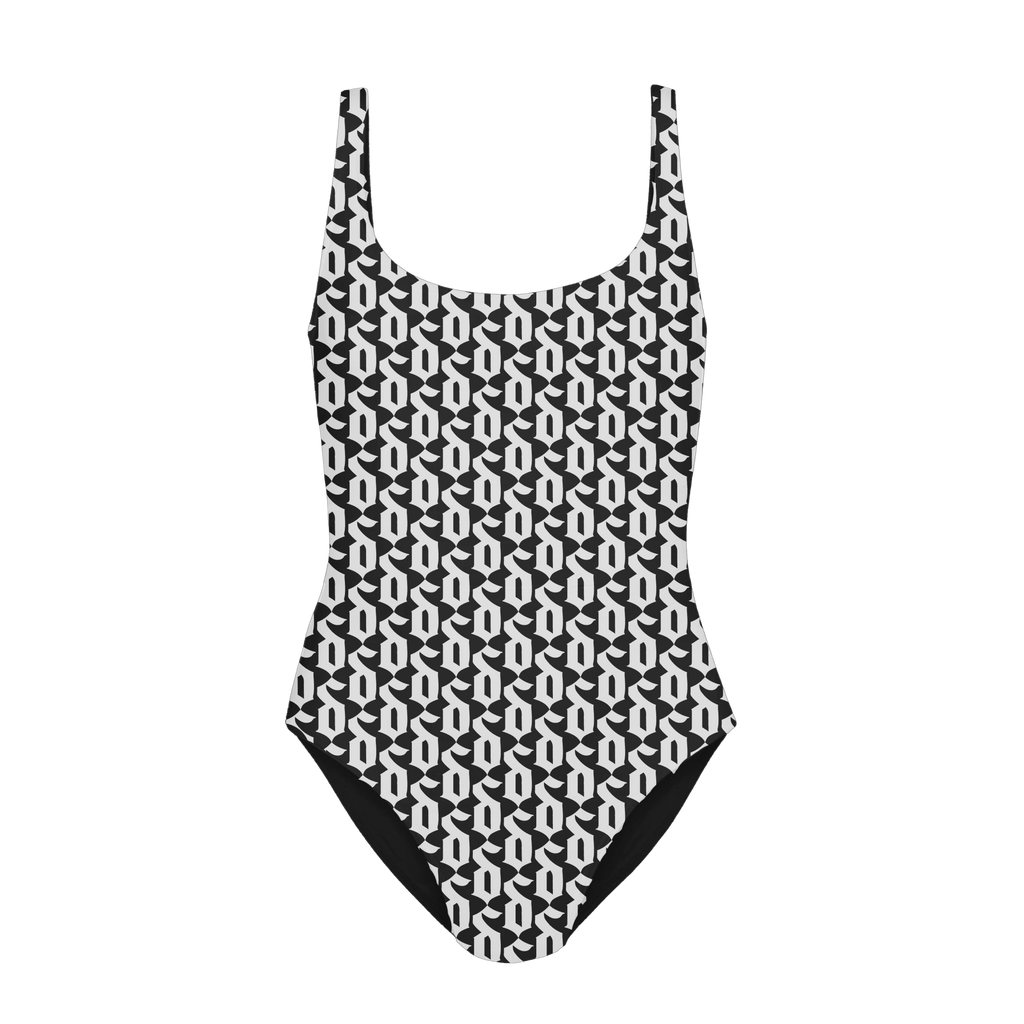 The Logo One Piece Swimsuit from Shinedown features a repeating pattern of the bands logo in white over a black base of an 82% polyester 18% spandex one piece swimsuit. The back is a low scoop and the bottom is a cheeky fit.