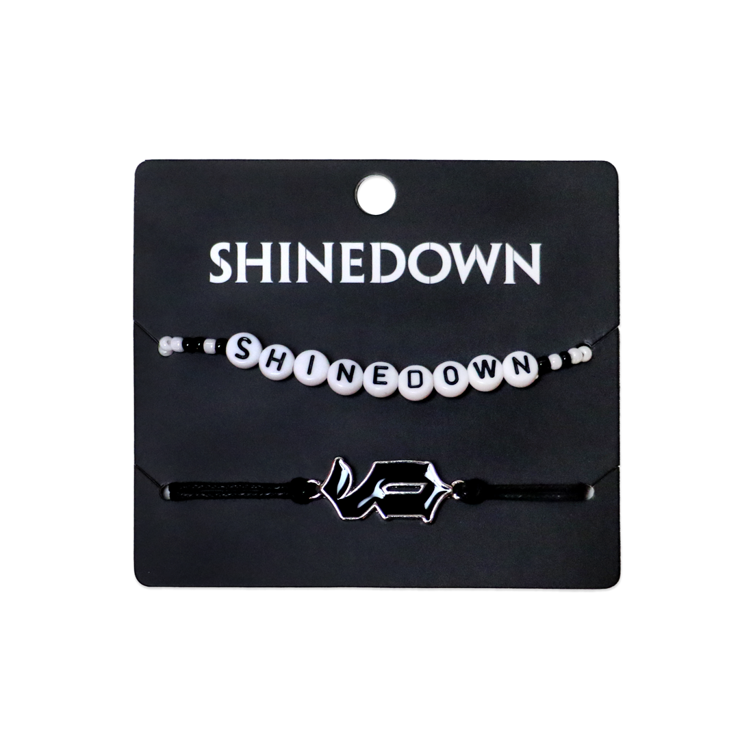 The Shinedown “Planet Zero Bracelet Set” comes with two bracelets. The first is a beaded bracelet featuring the band's name surrounded by black and white beads - the second is a black string bracelet with a metal charm of Shinedown’s logo in the middle. Both bracelets come on a cardboard backer.YOU MIGHT ALSO LIKE