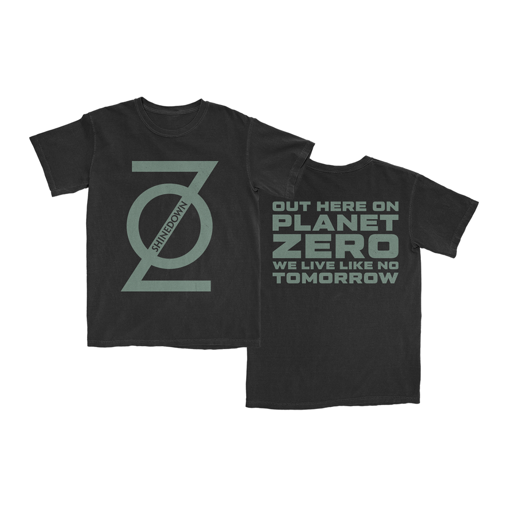 The ‘Secondary Z Logo Tee’ features Shinedown’s Planet Zero logo printed on the front and 'Out Here on Planet Zero We Live Like No Tomorrow” printed on the back of a black unisex t-shirt.