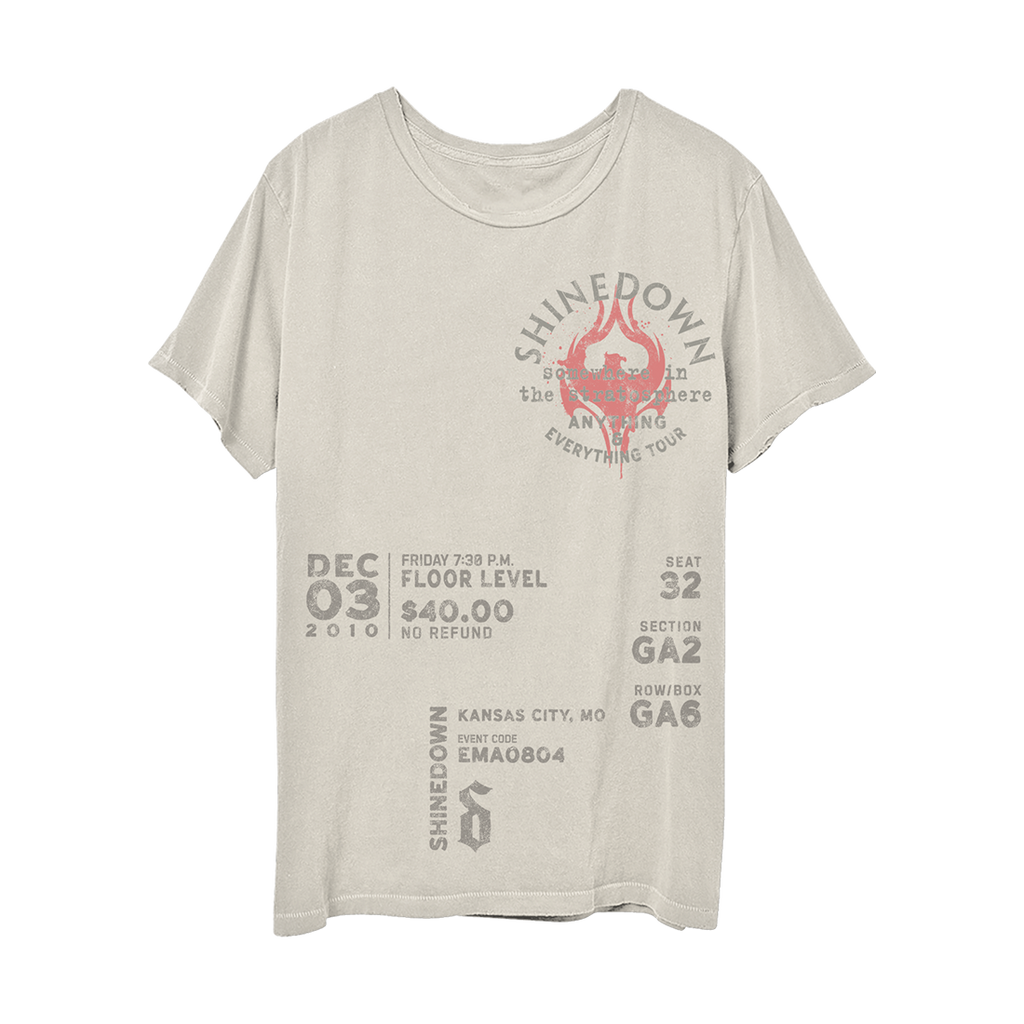 The Somewhere in the Stratosphere Acoustic T-shirt from Shinedown features details from the acoustic show featured on the live album "Somewhere in the Stratosphere" from the 2010 Anything and Everything Tour in Kansas City, MO. These designs are printed on the front of a 100% cotton vintage white t-shirt.YOU MIGHT ALSO LIKE